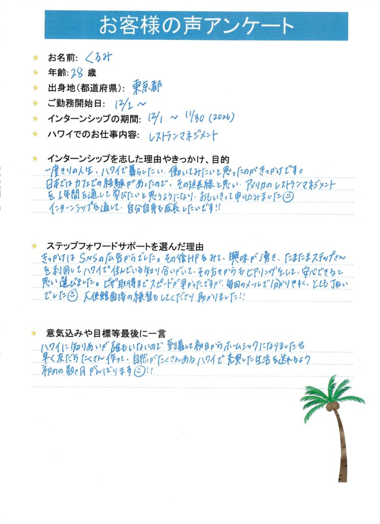 きっかけはSNSの広告からでした。その後HPをみて、興味が湧き、たまたまステップさんを利用してハワイで住んでいる知り合いがいて、その方々からもヒアリングをして、安心できると思い選びました。ビザ取得までスピードが早かったですが、毎回のメールで分かりやすく、とても丁寧でした😊