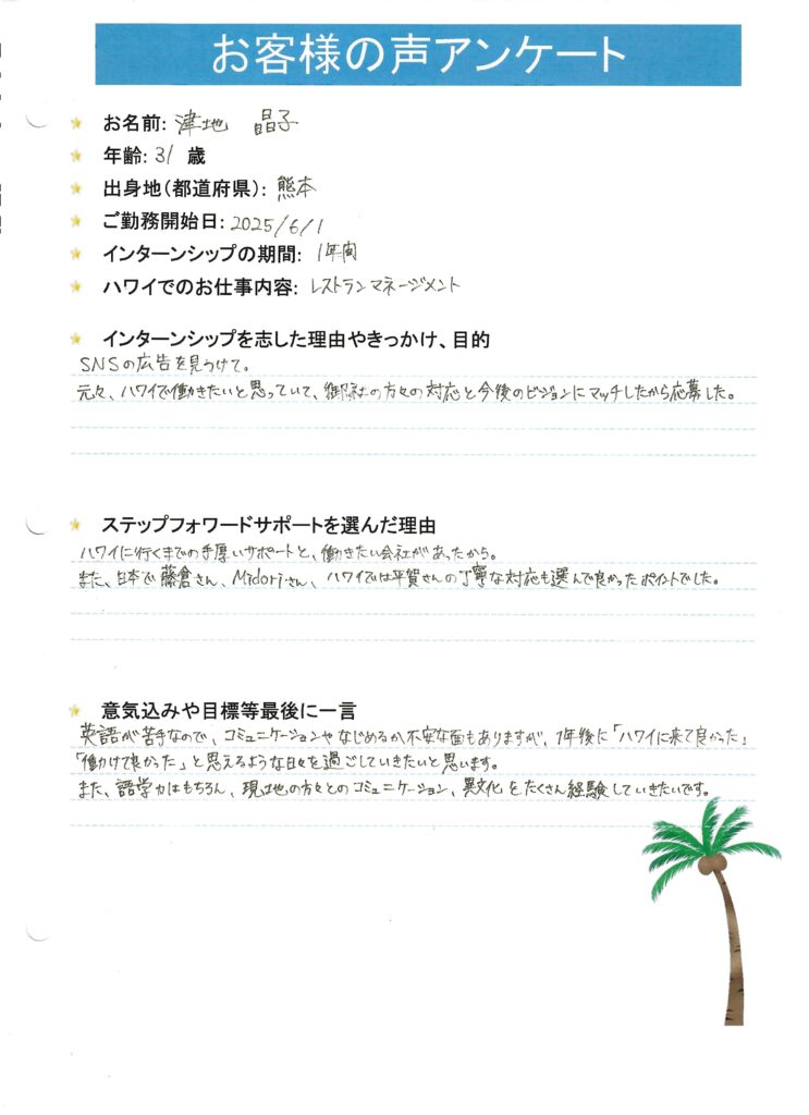 元々、ハワイで働きたいと思っていて、御社の方々の対応と今後のビジョンにマッチしたから応募した。